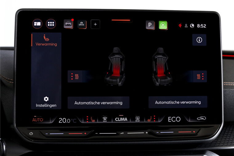 Het interieur is sportief en hoogwaardig afgewerkt, met kuip sportstoelen in microvezel bekleding. De elektrisch verstelbare bestuurdersstoel met geheugen zorgt ervoor dat je altijd direct de juiste zitpositie hebt. Voor extra comfort zijn de voorstoelen verwarmd en is ook het stuur verwarmd, prettig op koude dagen. Daarnaast beschikt de auto over interieur voorverwarming/(koeling), zodat je altijd instapt in een aangename temperatuur. Alle rij-informatie wordt overzichtelijk weergegeven via het volledig digitaal instrumentenpaneel.